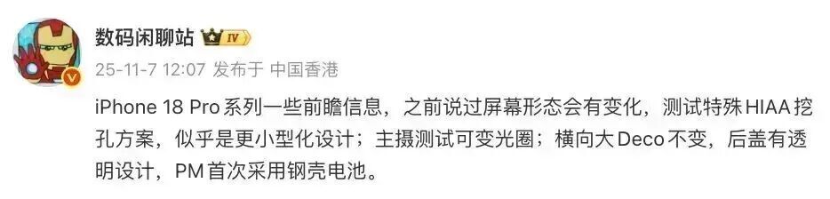 不过除了这个奇怪的分批发布爆料之外,关于iPhone 18的配置,也已经爆出了:
