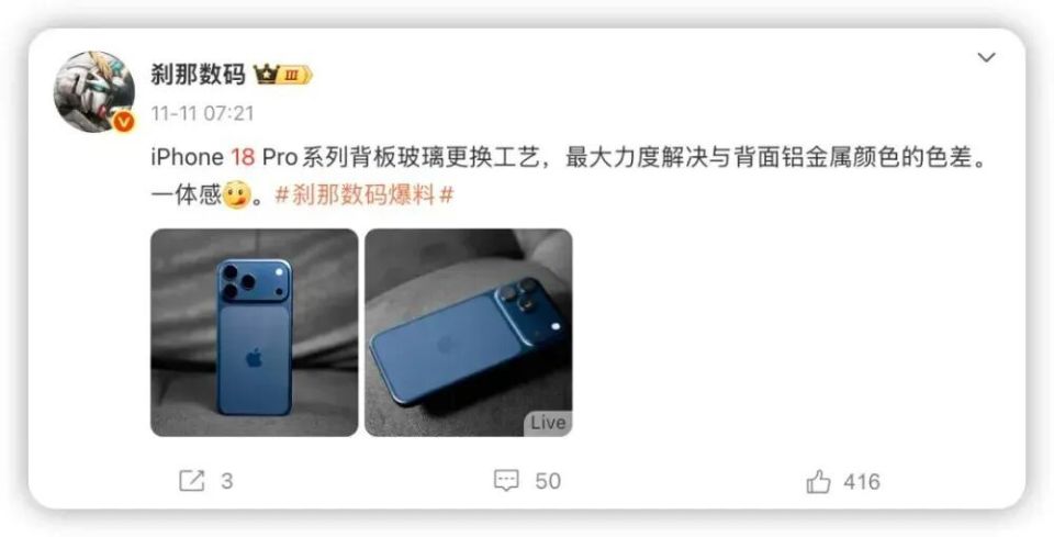 有消息称iPhone 18 Pro会更换背板玻璃工艺,最大力度解决与背面铝金属颜色的色差,我觉得这个可以有。