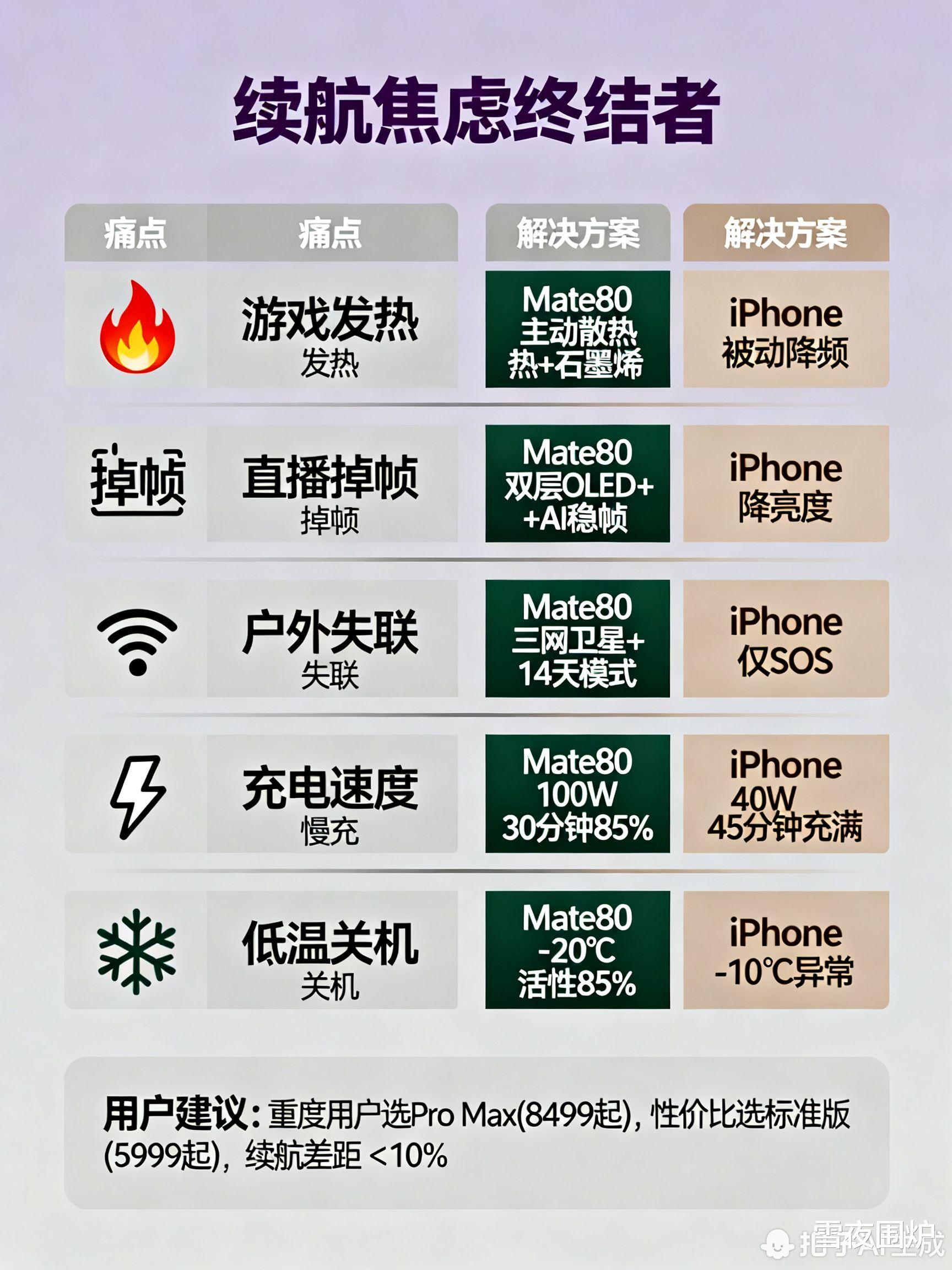 Mate80通过 “硅碳负极电池+100W快充+卫星通信功耗优化+主动散热” 四重技术,在游戏、直播、极寒、无网等极端场景下碾压iPhone。正如极客实测反馈:“这不是续航升级,而是彻底消灭电量焦虑”。