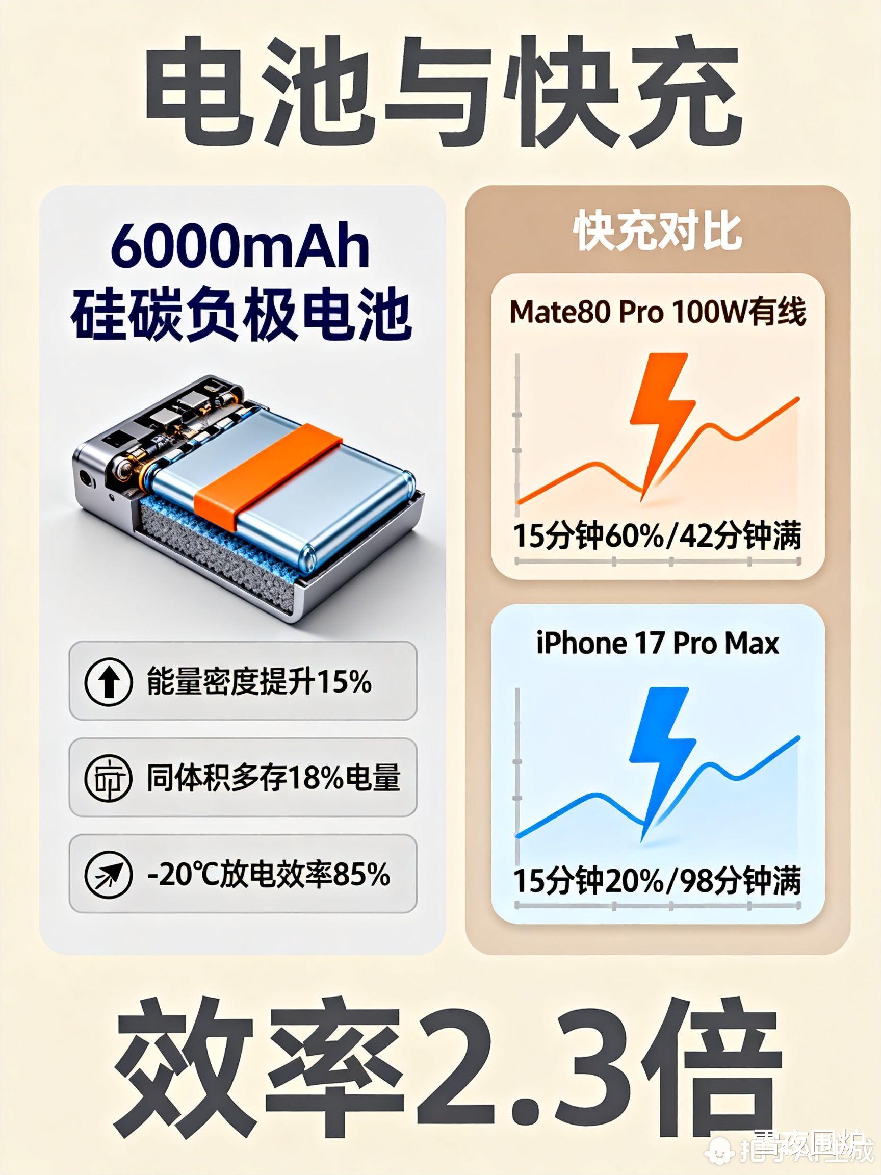 6000mAh硅碳负极电池能量密度提升15%,同体积多存储18%电量低温技术突破:-20℃环境放电效率达85%,iPhone 17 Pro Max(5000mAh)同一环境续航衰减40%