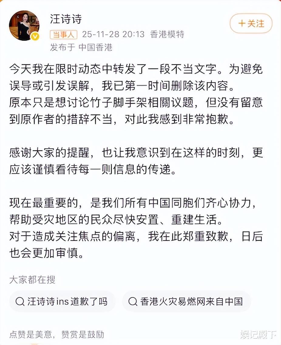 没多久后汪诗诗便删除了所发布的内容,并在微博里面道歉表示自己因为不当文字引发误解,目前已经第一时间删除内容,对此深感抱歉,现在最重要的是我们所有中国同胞们齐心协力帮助灾区地区的民众尽快安置,重建生活。