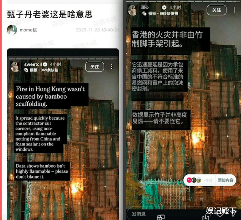 11月28日,甄子丹老婆汪诗诗在国际社交平台ins上发文表示:“香港的火灾并非由竹制脚手架引起的,它迅速蔓延是因为承包商偷工减料,使用了来自中国的不符合标准的易燃网和窗户上的泡沫密封剂,数据显示竹子并非高度易燃,请不要怪它”。