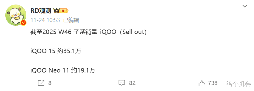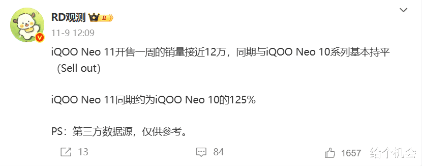 据博主RD观测统计的数据显示,iqoo neo 11开售一周销量接近12万台,同期与上代iqoo neo 10系列基本持平,同期是iqoo neo 10的125%,单机销量对比上代是有增长的,截至2025年第46周(11月16日),iqoo neo 11的销量大约是19.1万台,超越更早发布的一加ace 6。