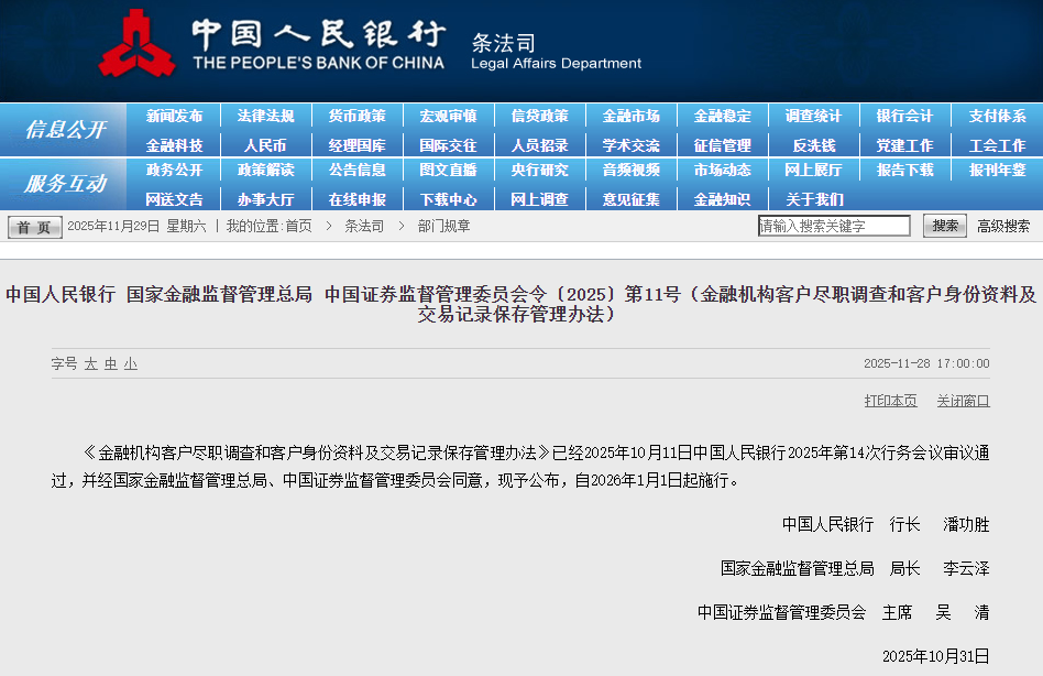红星资本局11月29日消息据中国人民银行官网,11月28日,中国人民银行、国家金融监督管理总局、中国证监会联合发布《金融机构客户尽职调查和客户身份资料及交易记录保存管理办法》(以下简称“管理办法”),该《管理办法》将从2026年1月1日起施行。