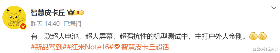 但近期有博主称红米Note 16系列将会拥有超大电池+超大屏幕+超强抗性的卖点,届时对千元市场来说,冲击力十足。