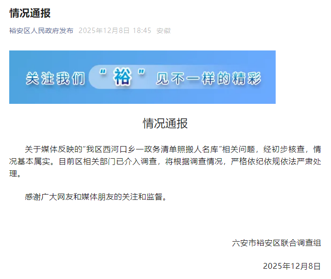 关于媒体反映的“我区西河口乡一政务清单照搬人名库”相关问题,经初步核查,情况基本属实。目前区相关部门已介入调查,将根据调查情况,严格依纪依规依法严肃处理。