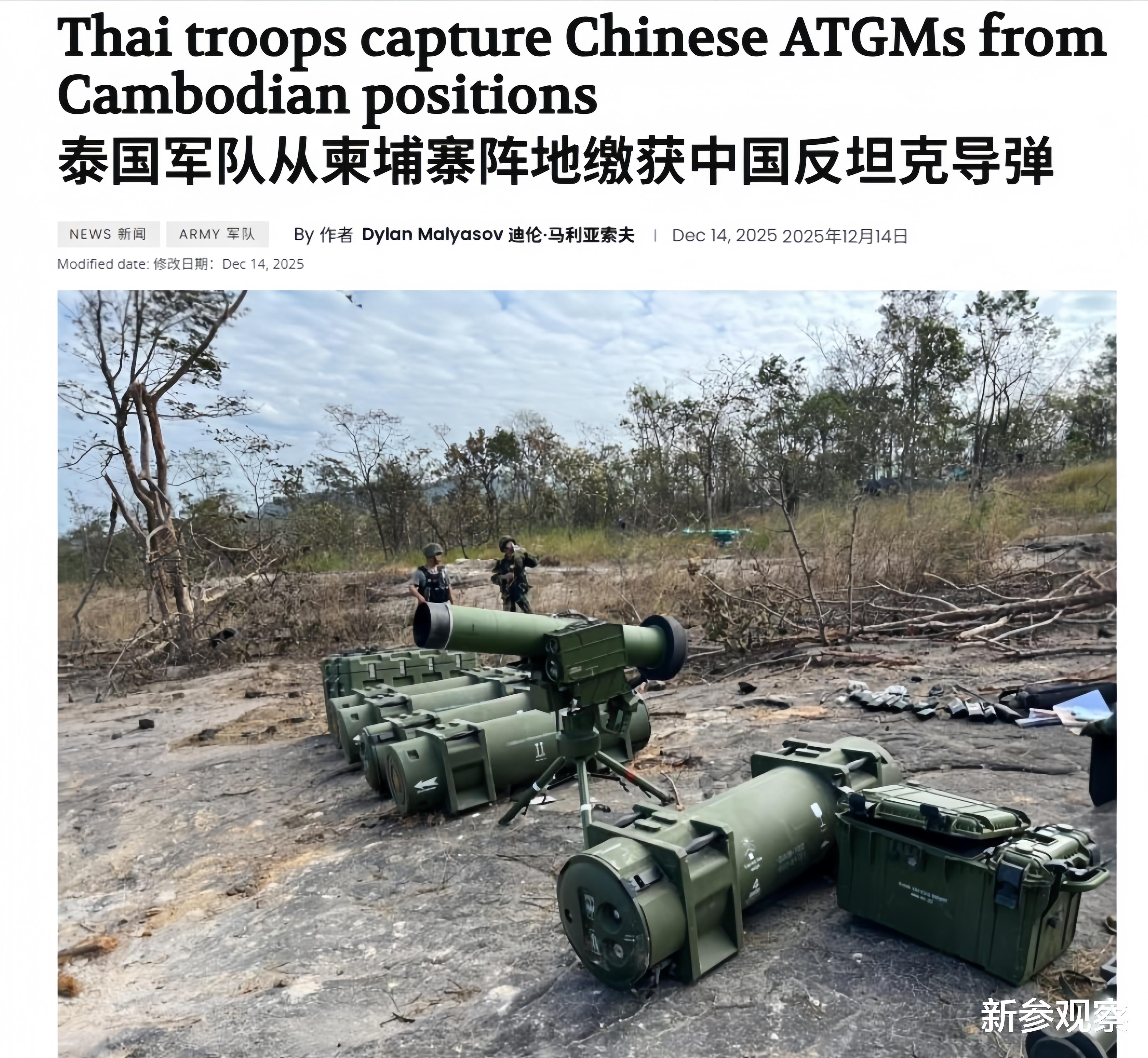 12月14日,外媒《防务博客》报道,泰国军队在与柬埔寨军队的冲突中,缴获了中国生产的反坦克导弹。清华大学教授吴大辉表示,从图片上看,可能是第五代远程GAM-102LR反坦克导弹及其发射与控制系统。东方卫视军事评论员刘乐留言称,这是湖北某公司生产的产品。截止发稿,虽无官方信息验证,但可信度较高。姑且认为是事实。