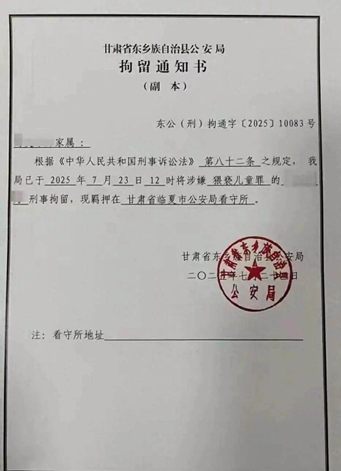 直到7月21日,案件转为刑事案件。7月23日,甘肃省东乡县公安局给小艾的家属出具了一份拘留通知书,上面显示“我局已于2025年7月23日12时将涉嫌猥亵儿童罪的XX(即小艾)刑事拘留”。