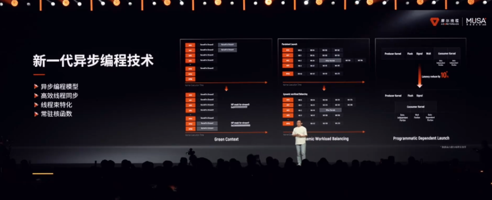 其次是异步编程与超大规模互联的支持。新一代异步编程模型,能够更好地优化任务调度与并行极致,而通过自研的MTLink高速互联技术,将支持十万卡以上规模的智算集群扩展。