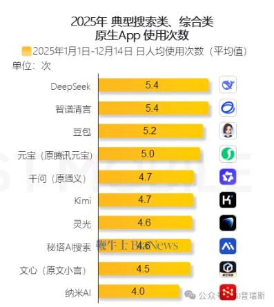 但这并不意味着豆包能“稳坐钓鱼台”。腾讯的AI助手“元宝”于2024年5月发布,在2025年初接入DeepSeek-R1模型后启动激进推广。据QuestMobile数据,元宝日活在一周内实现十倍增长,并一度登顶iOS免费榜,日人均使用次数5.0次。阿里方面则将AI超级入口的重点从夸克转向千问App,正在加速与淘宝、高德等应用打通。