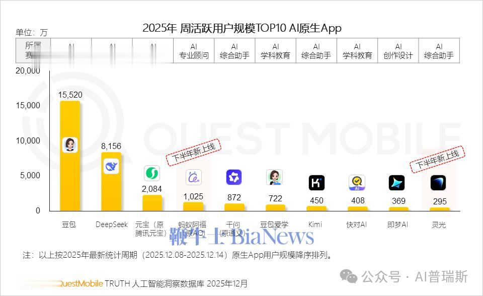 在国内市场,将在2026年春晚登场的豆包已成为增长最快的AI助手之一。自2023年8月上线以来,豆包一方面持续迭代基础模型能力,另一方面依托抖音生态进行大规模投放与快速功能更新。QuestMobile数据显示,当前豆包周活跃用户数已超过1.5亿,位居国内AI原生App第一。