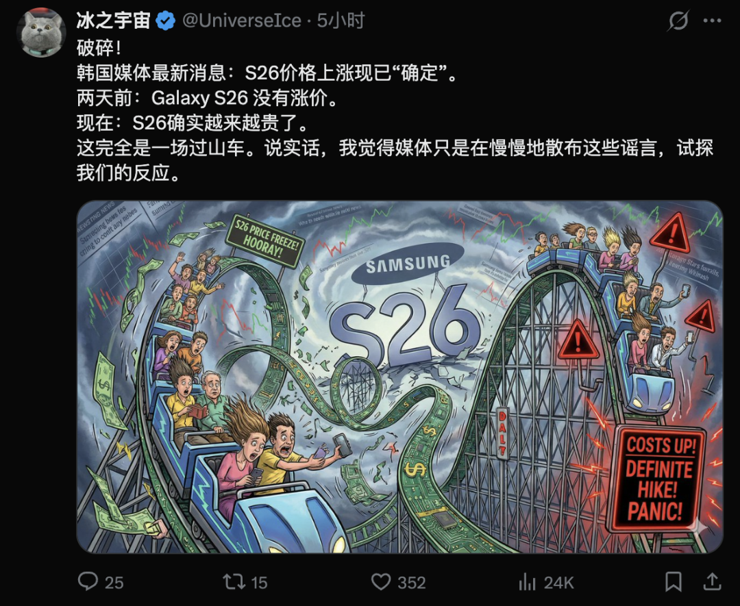 上周,韩国《美一商业报》报道,三星将以与Galaxy S25相同的价格推出全新Galaxy S26系列机型。考虑到这些手机在又一代中,升级幅度较前一代极少,这也说得通。然而,这种兴奋感并未持续太久,新的报道开始暗示价格上涨的可能性很强。据另一家韩国新闻媒体FN News(经X分析师Jukan报道)报道,三星因零部件价格飙升,尤其是DRAM和NAND模块,以及韩元波动剧烈,被迫提高Galaxy S26的价格。报告称,三星的MX(移动体验)部门已无法在利润下滑的情况下维持运营,因此必须提高价格。虽然涨价可能不限于智能手机,也可能延伸到三星电子制造的其他IT硬件,但该媒体对Galaxy S26系列的价格涨幅进行了大致估算。据估算,256GB版本的Galaxy S26各型号价格可能比Galaxy S25系列上涨最多88,000韩元(~60美元)。如果属实,这将是三星过去四代中首次提高手机基础价格。
