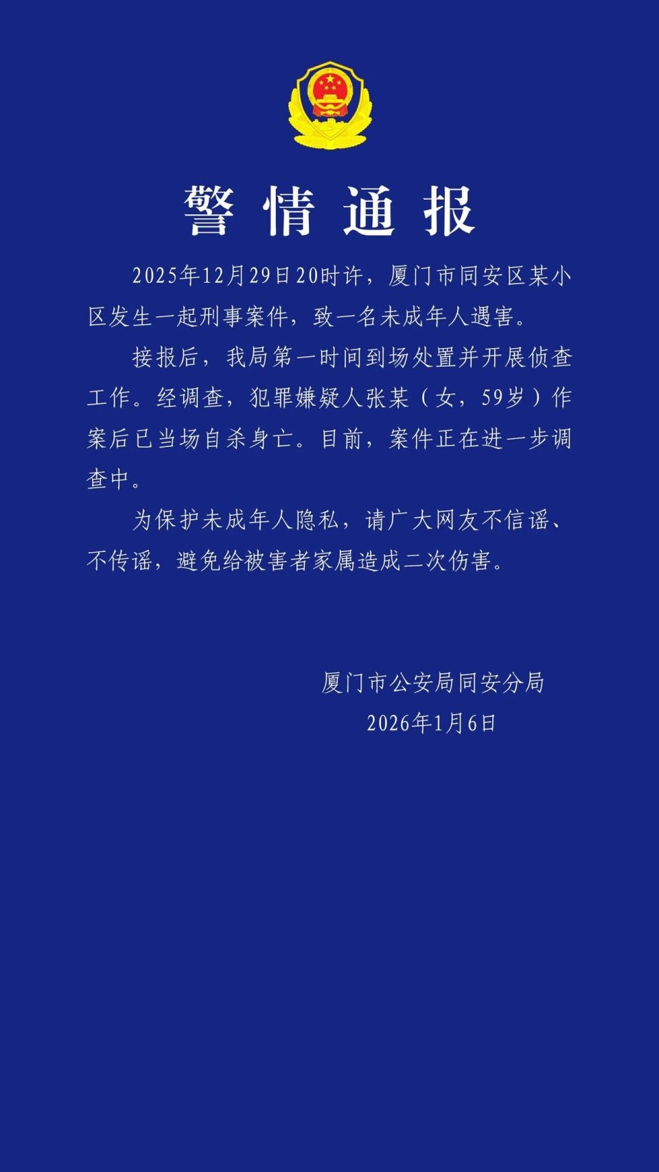2025年12月29日20时许,厦门市同安区某小区发生一起刑事案件,致一名未成年人遇害。