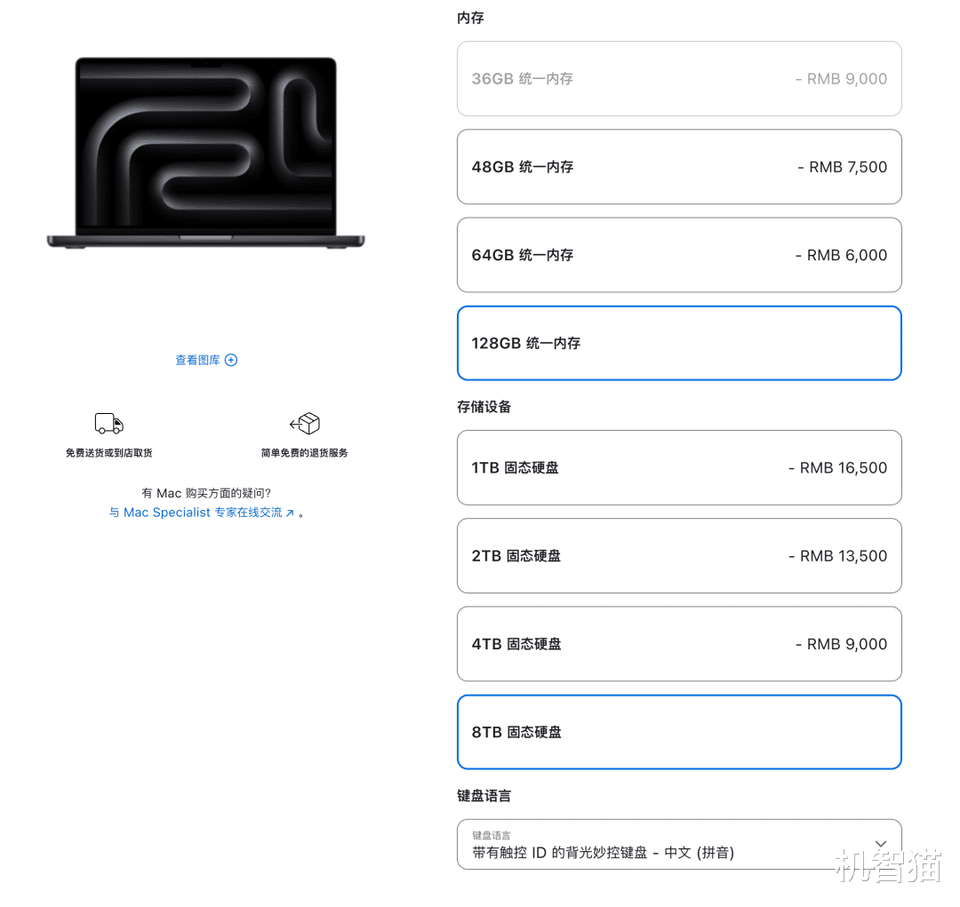 更丰富的配置选择:这主要是针对Mac用户,在苹果官网,官方提供了更多的配置选择服务。比如48\64\128GB,或者是4TB\8TB的固态硬盘,适合一些专业人士或者工作室采购需求的用户。在京东、天猫等渠道,类似的高规格配置方案,很多都显示“无货”。对于这类用户来说,他们采购Mac的最佳渠道就是官网,直接立省800-1000元,对于他们来说你也有一定的吸引力。
