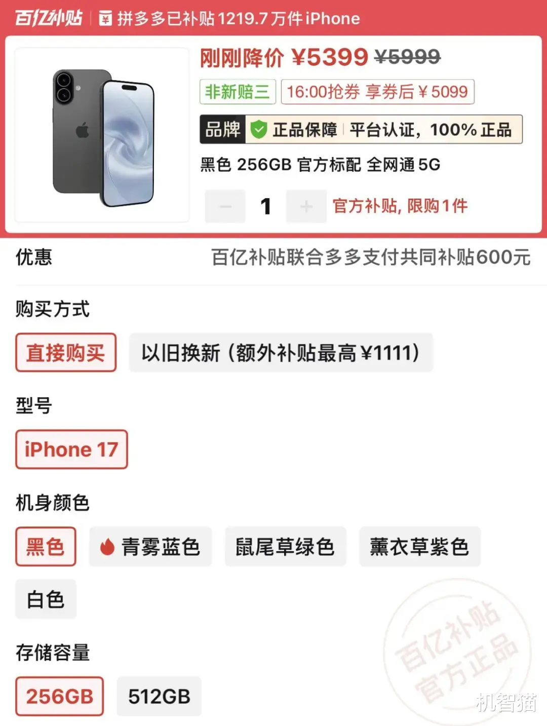 iPhone16也是如此。需要特别注意的是,苹果官网的iPhone16此前已经下架了所有的大存储版本,仅仅保留了128GB版本。参与新春优惠之后,其售价为5399-300=5099元。但在第三方电商渠道,iPhone16的256GB版价格已经做到5000元以内。甚至iPhone17的256GB版本,叠加了优惠之后,也能做到5099元。谁更有性价比,自然不用多说。