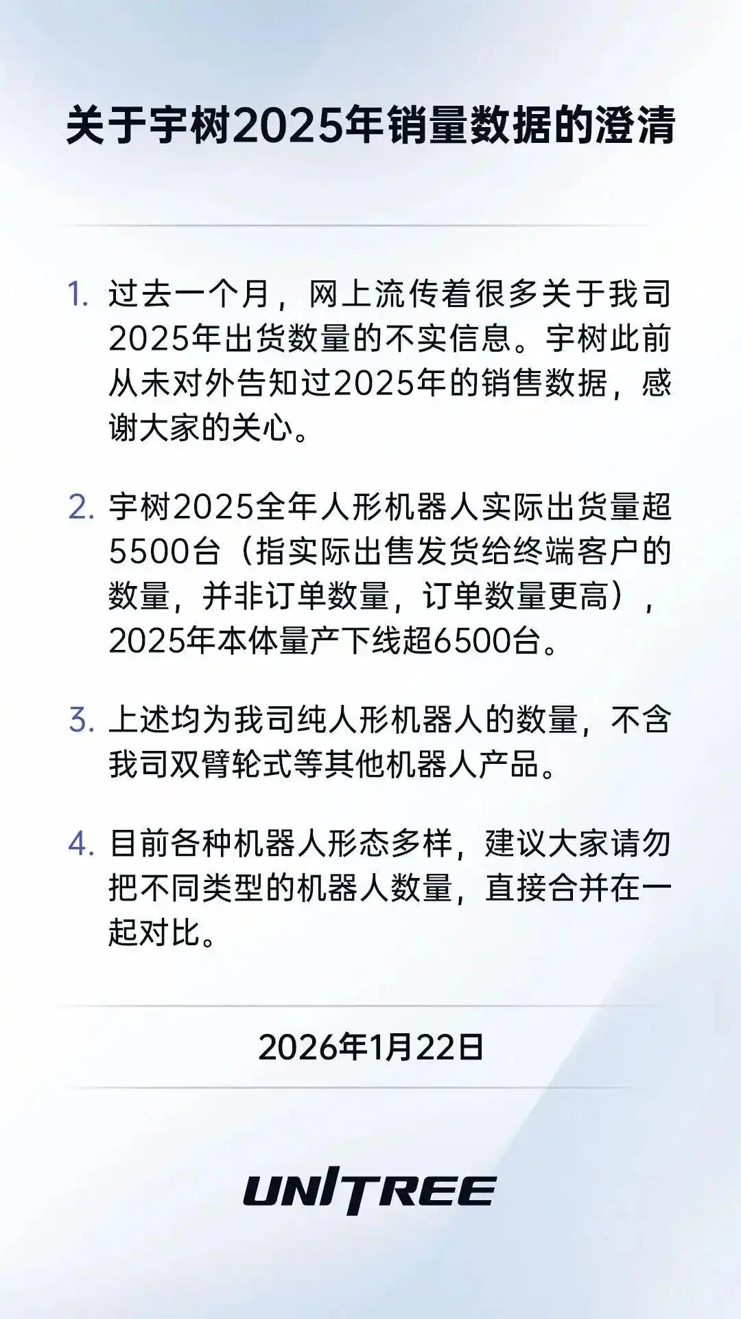 1月22日晚,宇树科技官方微信公众号发布了一份关于2025年销量数据的澄清。宇树称,过去一个月,网上流传着很多关于宇树2025年出货数量的不实信息,宇树此前从未对外告知过2025年的销售数据。