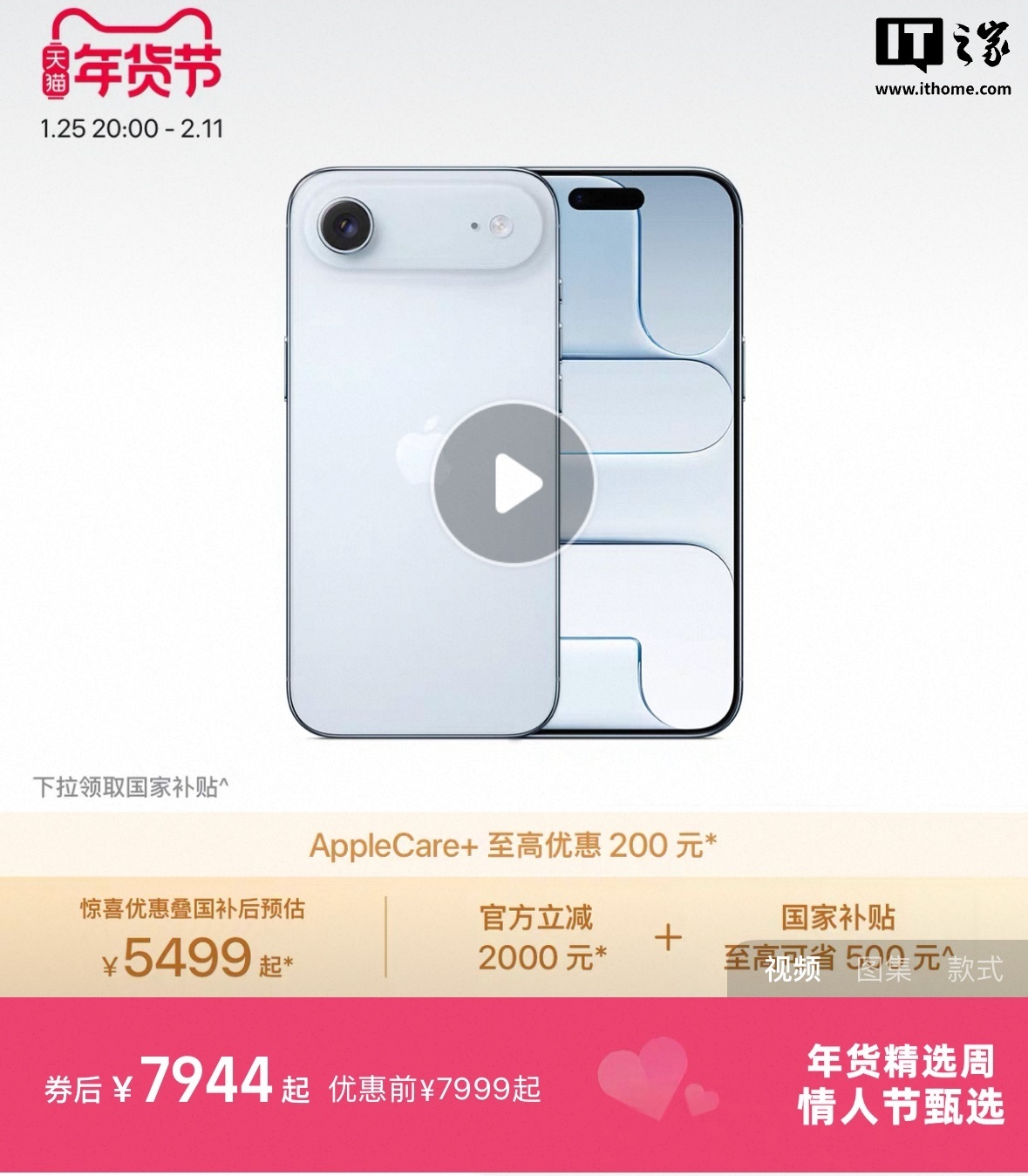 苹果AppleStore天猫旗舰店显示,苹果iPhoneAir手机将于“天猫年货节(1月25日20:00至2月11日)”期间进行促销,该机国行原价7999元起,活动期间可领2000元券,叠加部分地区500元国补后,到手价低至5499元(IT之家注:限量13000台)。