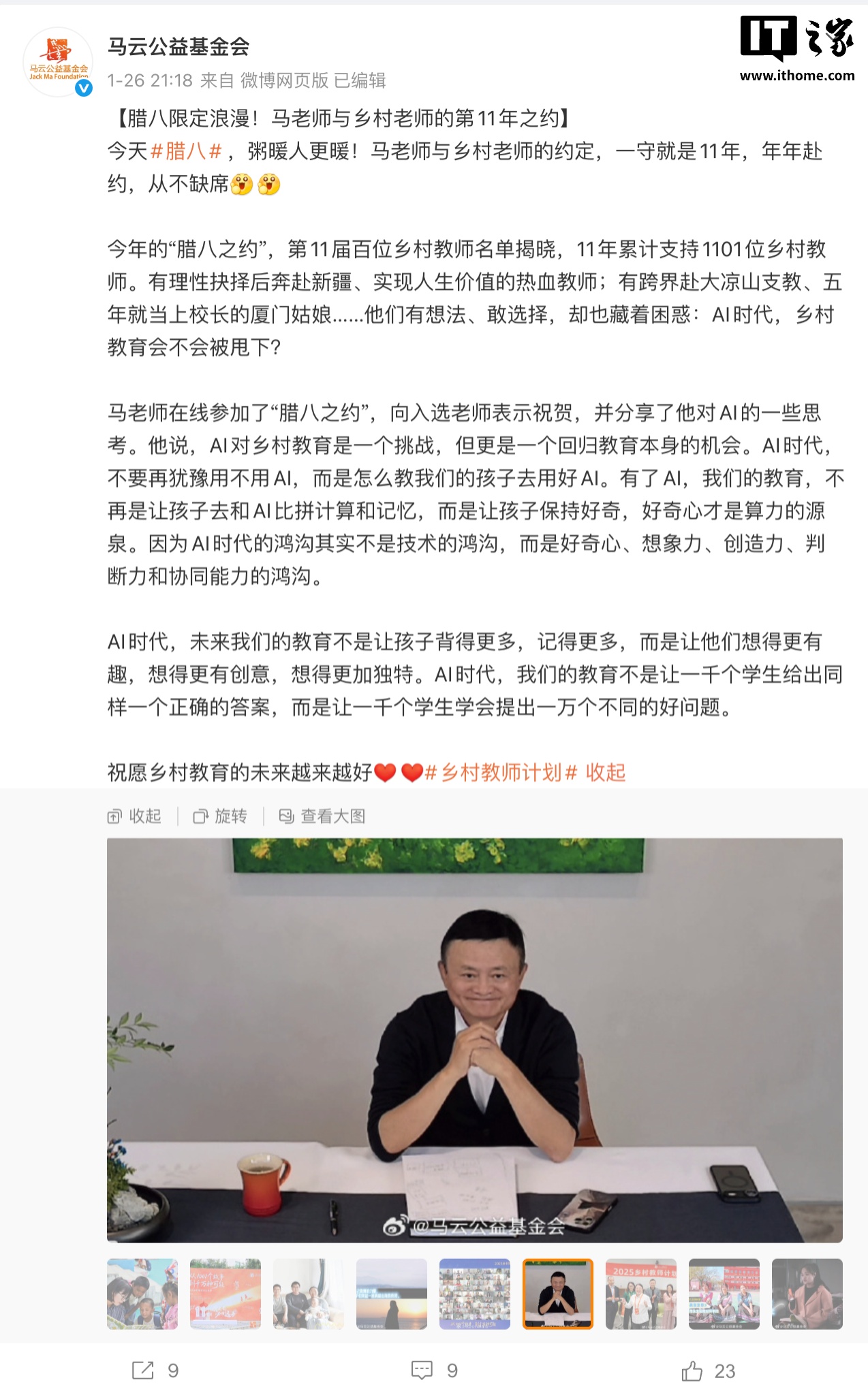 IT之家1月28日消息,据@马云公益基金会官微,1月26日的“腊八之约”活动中,马云分享了自己对AI的一些思考。
