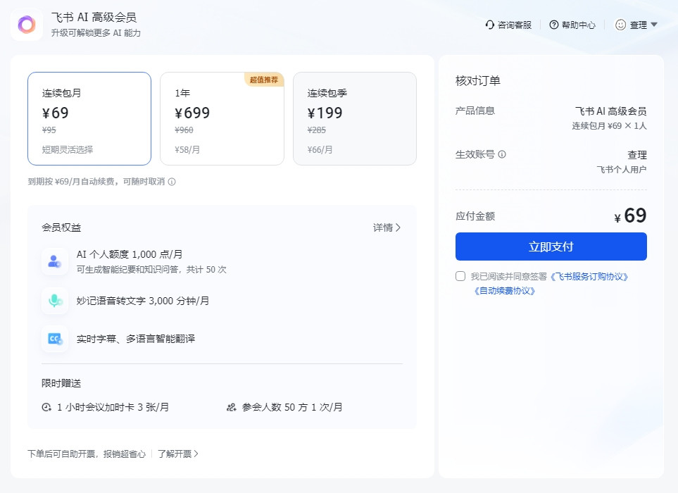 半年后就是每月300分钟的转写+2篇纪要,但凡有需求的用户都肯定要加钱买飞书的“AI高级会员”(可以多次叠加购买),后者的价格如下↓。