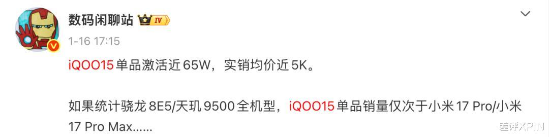 而对于 iQOO 来说,他们的底气来自于 iQOO 15 的卖爆,而且实销均价已经快 5 千。