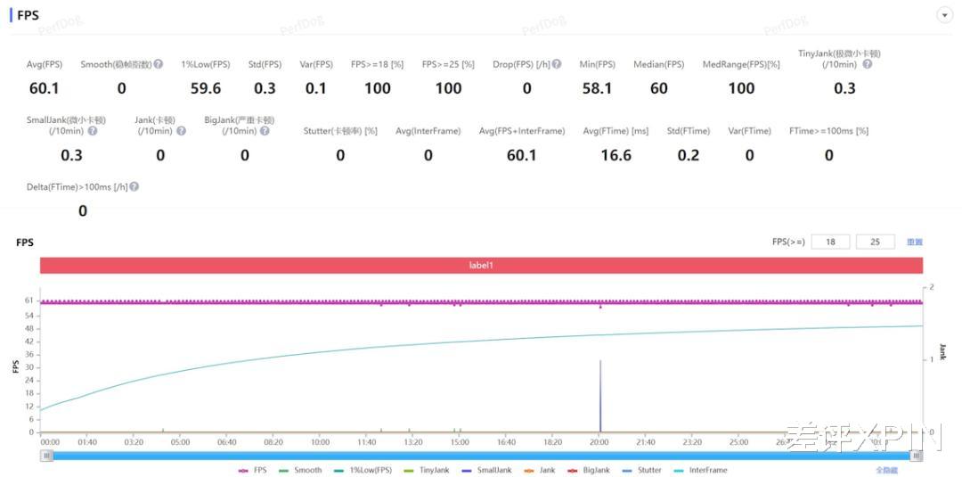 根据 Perfdog 抓取到的数据,在 60 帧 + 画质拉满的条件下,iQOO 15 Ultra 的原神纳塔跑图 30 分钟测试,平均帧为 60.1 帧,几乎就是一条水平的直线, 1% Low 帧只有 59.4 帧,整个跑图过程非常丝滑。