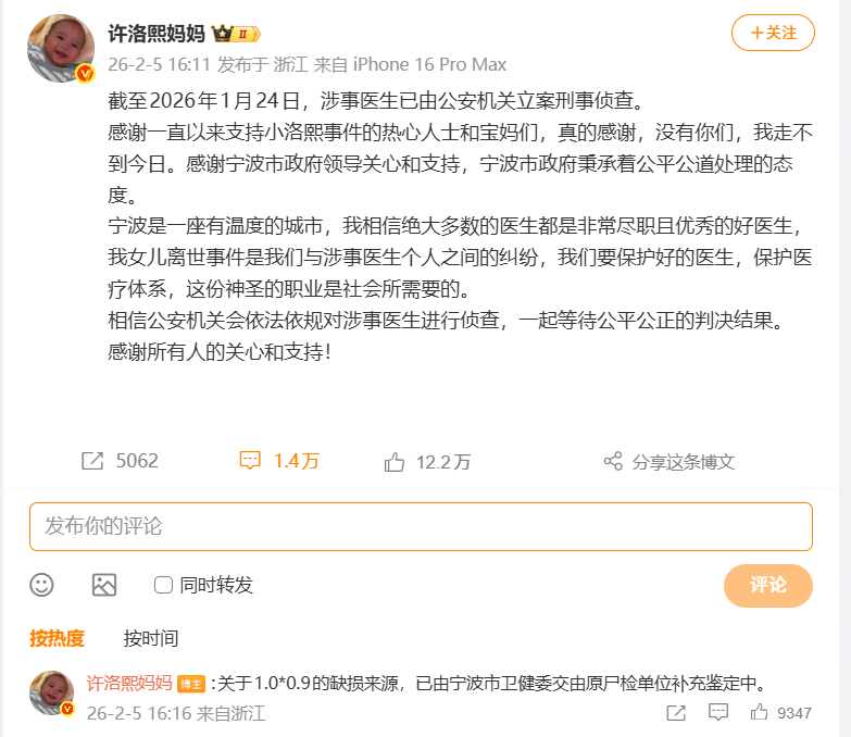 宁波发布“患儿术后离世”调查结果后,@许洛熙妈妈于2月5日发文透露,截至2026年1月24日,涉事医生已由公安机关立案刑事侦查。