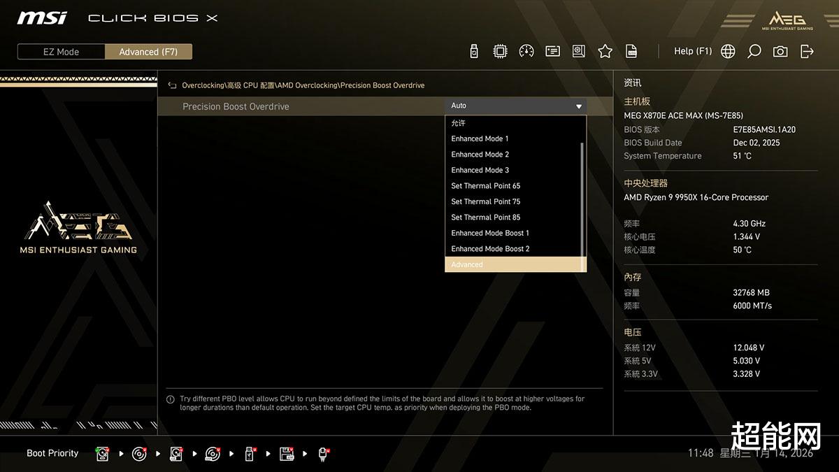 我们使用了锐龙9 9950X3D来测试主板PBO的功能,最高能开到Enhanced Boost 1这档,但不能加Boost频率。单纯开启PBO后CinebENCH 2026的多线程得分提高了1.7%,而Enhanced Boost 1那档则提升3.3%,这个新测试对CPU频率看似不是很敏感。