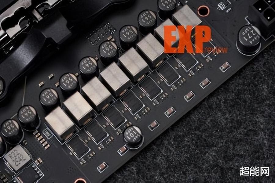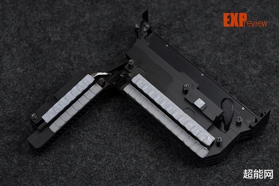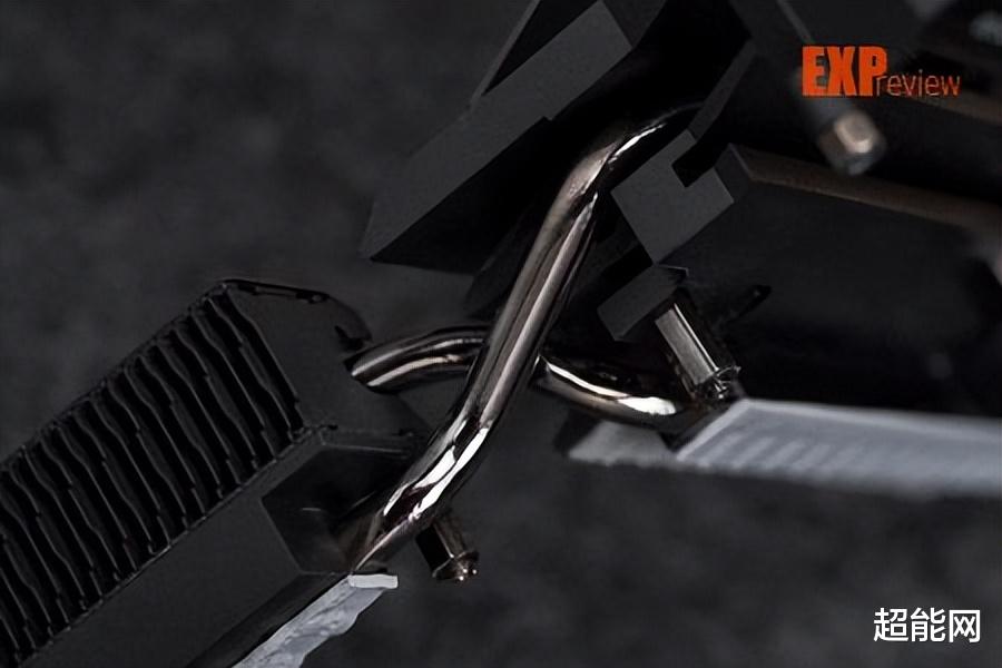 为了照顾这18+2+1相供电,微星为其准备了一套比较复杂的散热系统,左侧的是传统的铝压散热器,顶部的则是鳍片式散热器,两者使用了两根交错式热管互联,同时具备高热容与大散热面积的优点,热管与MOS管直接接触,并配以9W/MK的导热垫,让供电模块在高负载下也能稳定运行。