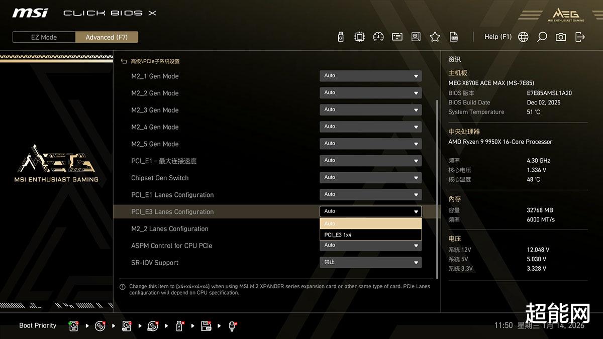PCI_E3与M.2_1,以及M.2_2接口与USB4主控的带宽切换开关在“高级\PCIe子系统”里面,可以根据自身需求来分配PCIe通道。