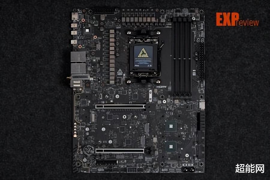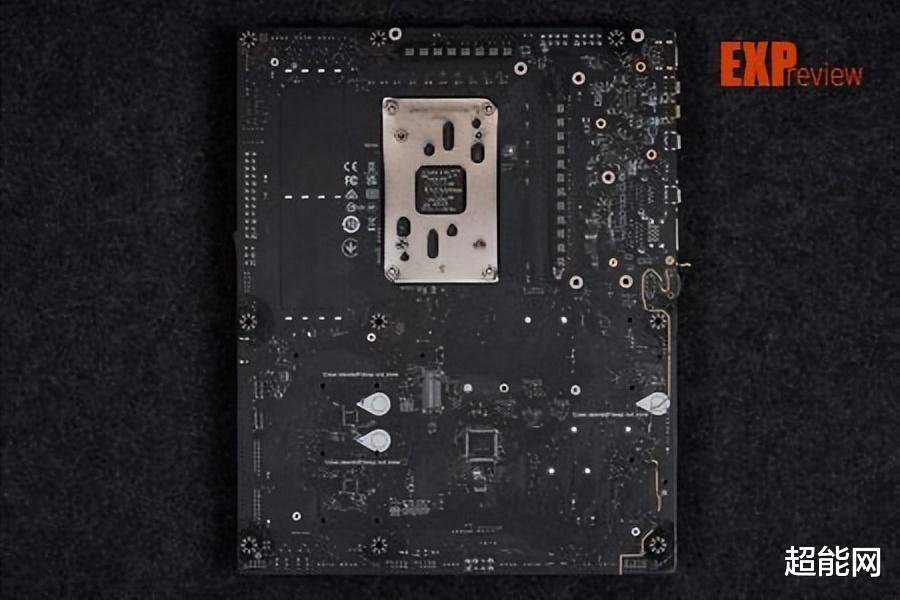 主板背部依然是保留了金属背板,同样用金漆印有品牌系列型号等元素,除了增颜值,更重要的是能够辅助背部发热元件进行散热,保护背部元件不受磕碰,提升主板的强度以减少PCB弯曲形变的程度。