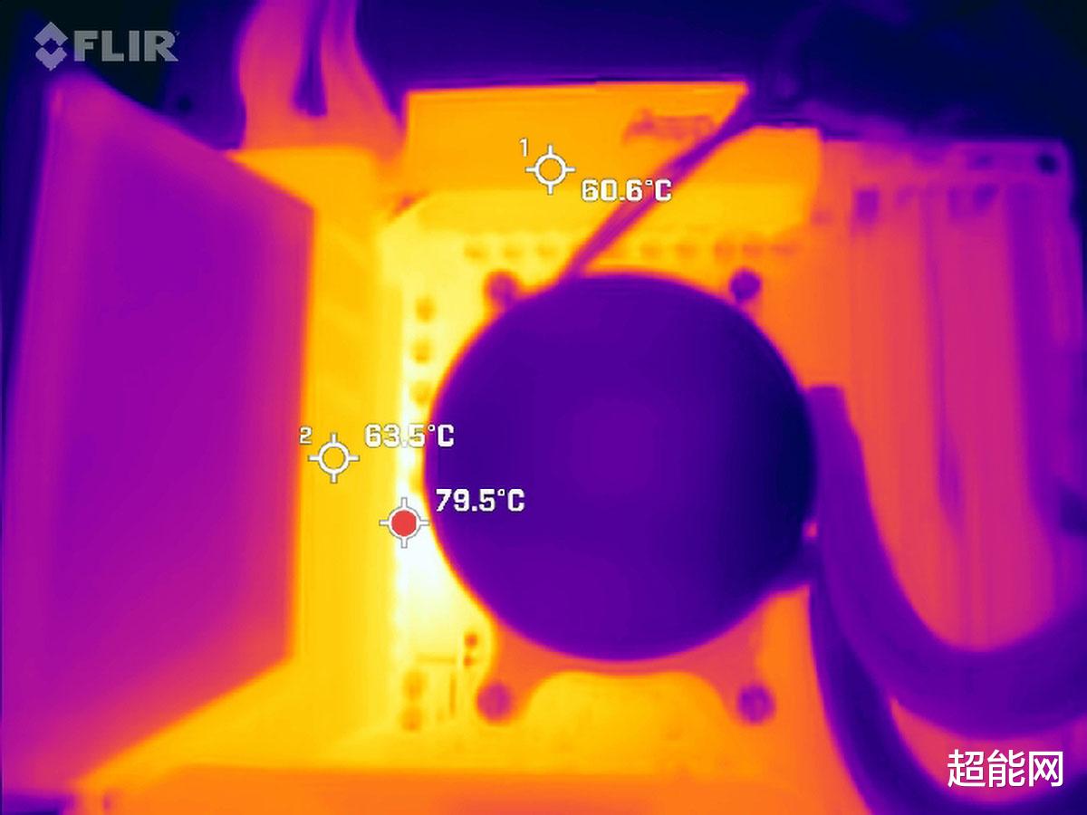 CPU供电模组在烤机时的最高温度是79.5℃,上方散热片表面温度60.6℃,左侧散热片温度则是63.5℃。这主板的供电散热已经做得很好了,18相CPU供电也能很好的把热量分散,降低单颗MOSFET热量,作为一款旗舰主板,自然可以带动AMD现在最新、最顶级的处理器,即使是下一代核心数量更多的产品也不在话下。