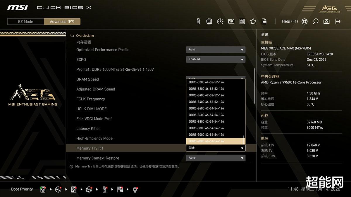 Memory Try It!里面有大量预设的内存频率与时序可供选择,这对与那些要进行内存超频的玩家来说非常方便,预设的最高频率能到9000MT/s。