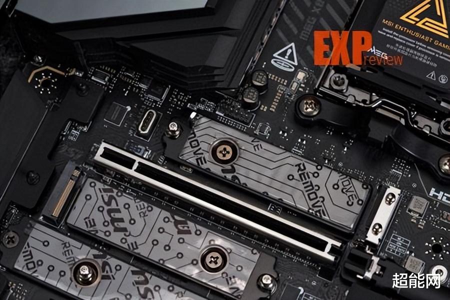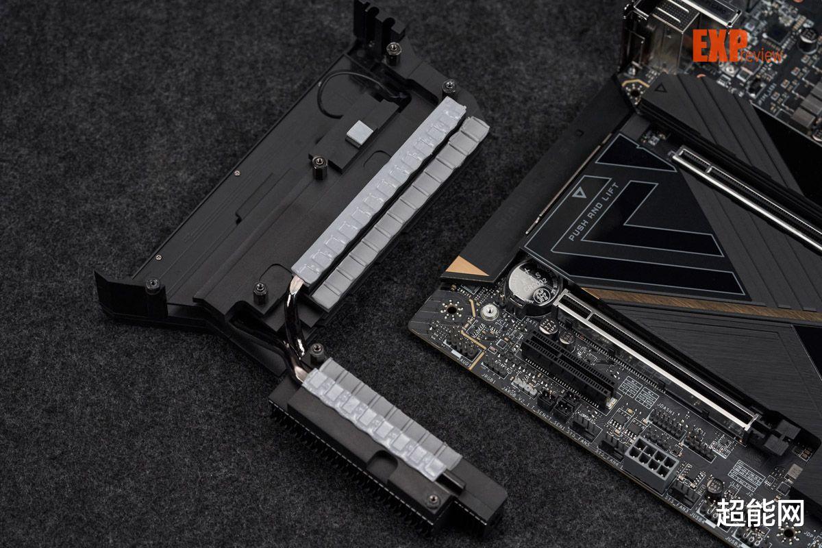 所有的M.2散热装甲和主板正面的M.2插槽都采用快拆设计,这块大的M.2散热装甲还得负责两颗南桥的散热,所以它上面还有一个专用的导热垫把下方南桥散热器的热量传递上来。主板正面的M.2口全部都配备双面散热,为SSD提供全方位的散热服务,保障SSD能全速稳定运行。