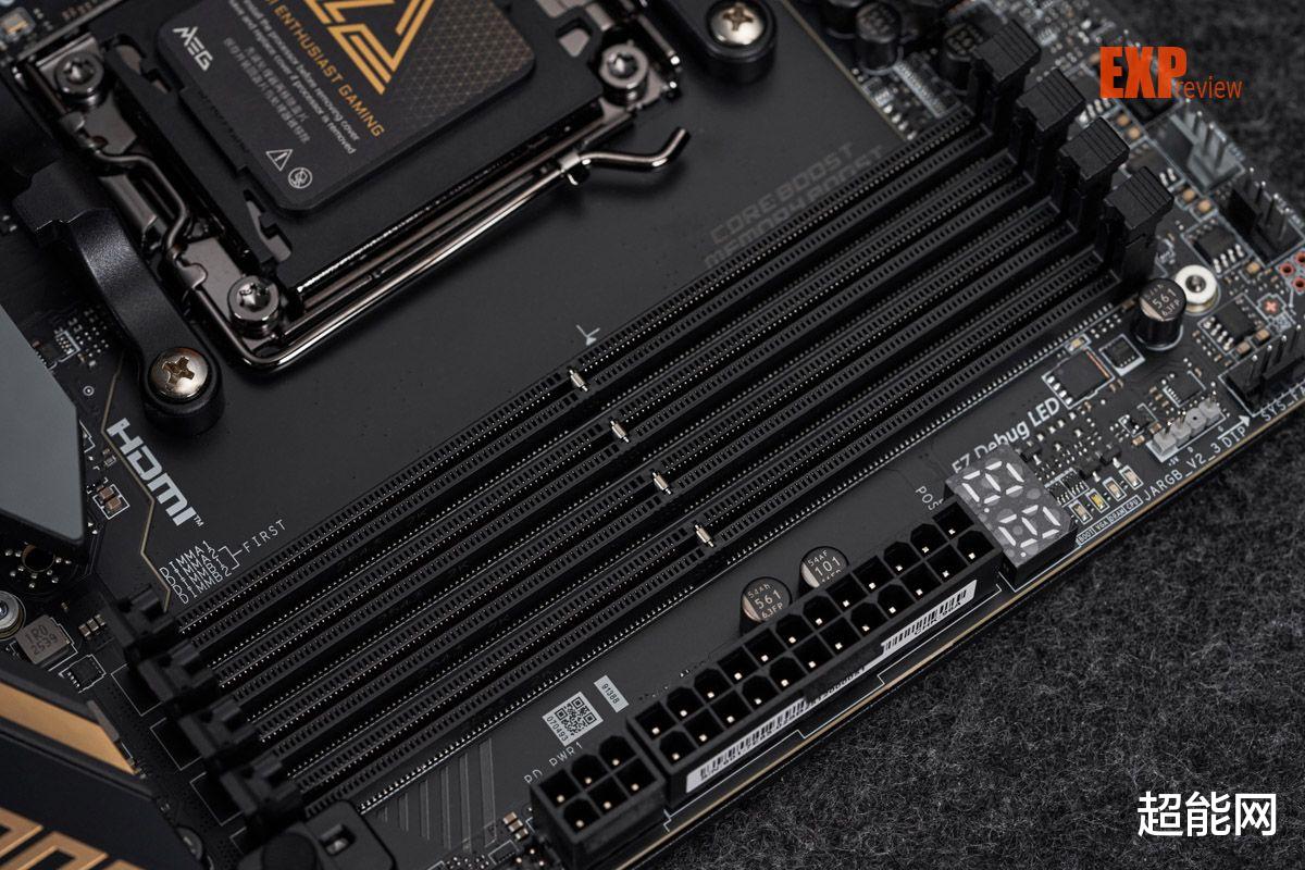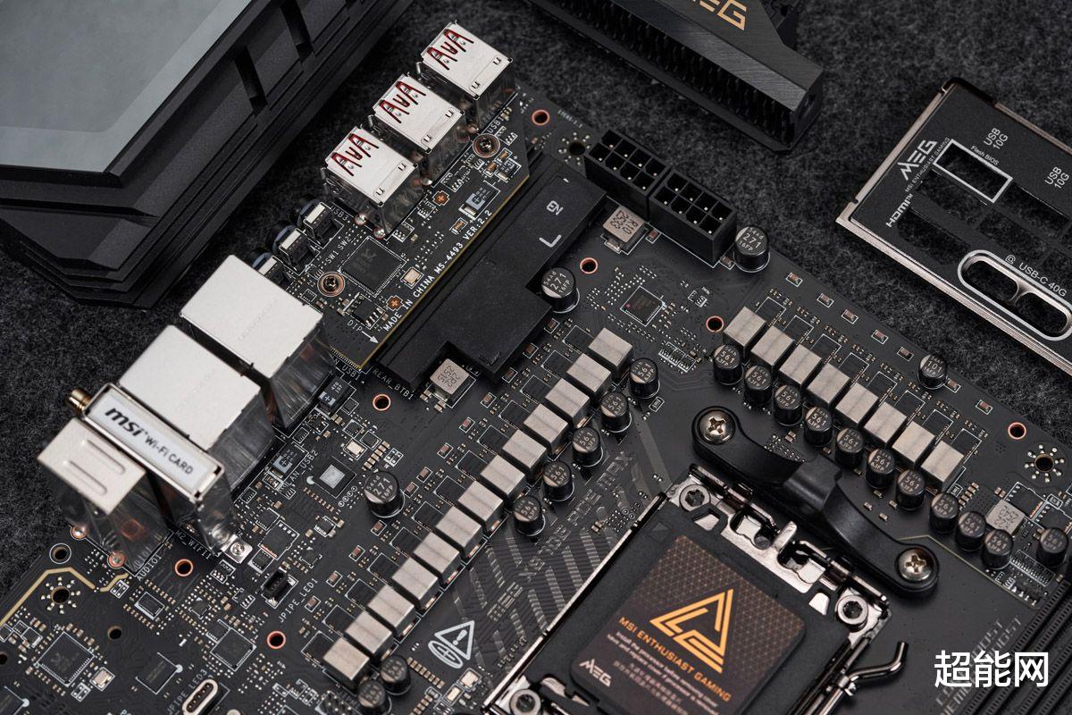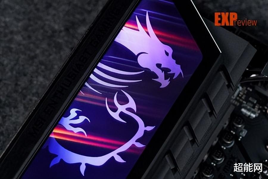 视角转向CPU供电区域,CPU插座上方的散热器有金色的MEG字样,而插座左侧的散热器上面则有巨大的单面镜,亮灯后你能看到巨大的龙图腾,设计比微星去年推出的MEG Z890 ACE主板又上了一个等级。