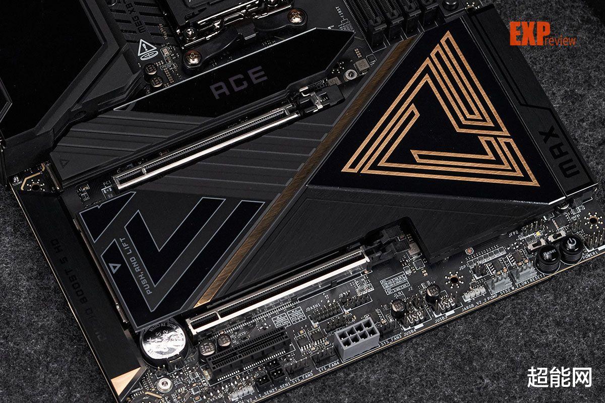 既然是微星最顶级的MEG系列主板,X870E ACE MAX战神自然就不会缺少金光闪闪的装饰,南桥上方巨大的金色三角形是MEG系列的Logo,这块巨大的M.2散热装甲有拉丝、磨砂和镜面三种不同的表面,并用简单的线条分隔成四个区域,上方区域的纹路还与另一块M.2散热器连得上,相当之有设计感。那块CPU下方的M.2散热器设计更是颇有X870E超神十周年限量主板的风格,一边是磨砂一边是单面镜,只不过单面镜下面的从屏幕变成了RGB灯。