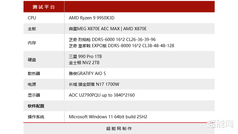 上机测试部分我们使用了旗舰处理器锐龙9 9950X3D来考验主板的供电能力,并且搭配芝奇 皇家戟 EXPO版 DDR5-6000 C26 16*2套装和皇家戟 EXPO版 DDR5-8000 C38内存来测试一下这款旗舰主板搭配高频内存和低延迟内存的性能。