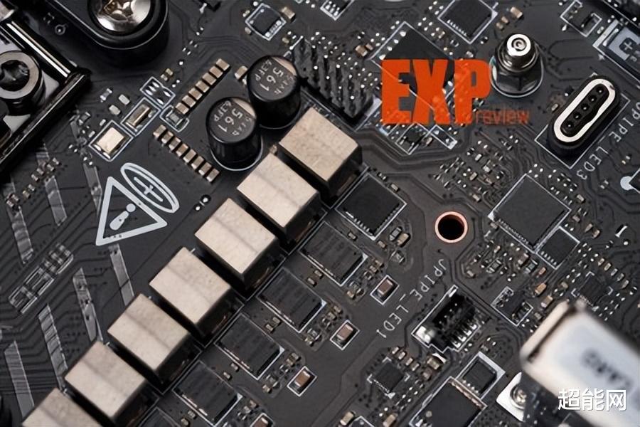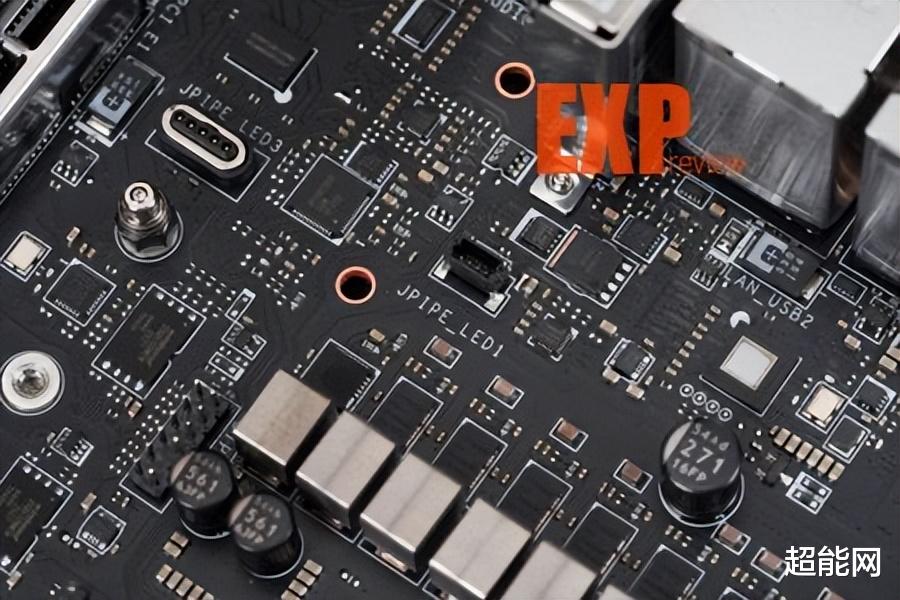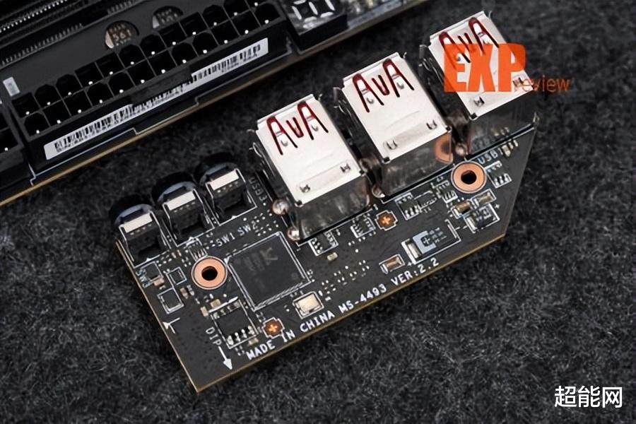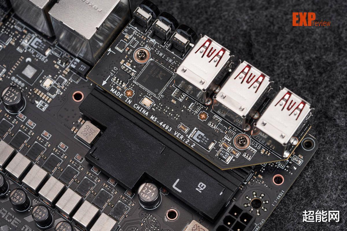 该主板的USB接口模块采用了双层设计,卸下散热马甲后,可以看到靠上的6个USB-A接口和3个背部按钮整齐地被焊在一块小PCB上。拆下小板后就能见到一个模块化的数据接口和为USB4接口配备的迷你散热装甲。两个USB4接口的控制芯片为祥硕ASM4242,是一款通过USB4和雷电4双认证的主控芯片,支持PCIe、USB和DisplayPort等多种协议,算是用得相当多的USB4控制芯片了。