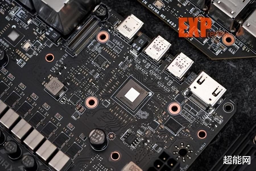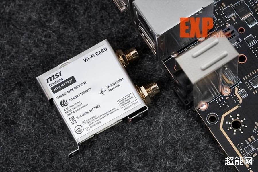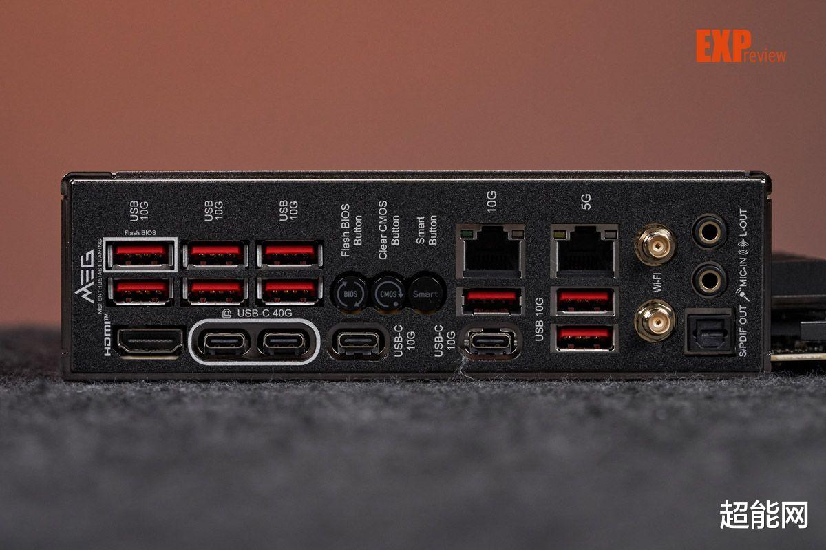 主板配备一体式I/O背板,提供了两个USB4 (40Gbps) Type-C口,它们支持DP 1.4视频输出,最高分辨率为4K 60Hz。两个USB 10Gbps Type-C口,九个USB 10Gbps Type-A口,2个3.5mm音频口和一个数字光纤输出口。网络连接方面,主板配备Marvell AQC113CS 10G以及Realtek RTL8126 5G有线网卡,无线网卡是联发科MT7927支持WiFi7和蓝牙5.4,并配套一体直插式WiFi 7天线。