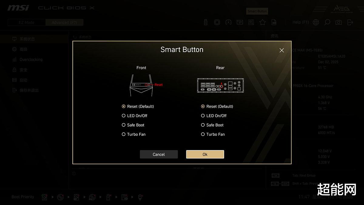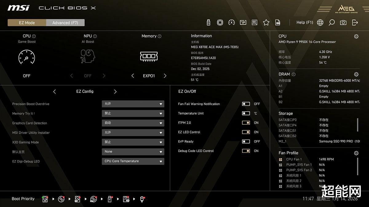 X870E ACE MAX战神的BIOS和微星这一代主板没啥大的区别,背景颜色是MEG的金黄色,简易模式下,EZ Config部分是最重要的改进点,包含了可直接提升CPU性能的PBO超频选项、显卡检测功能开关以及X3D Gaming Mode等功能,Memory Try it!功能也能够在简易模式下找到。通过上方的左右箭头可以切换到收藏栏,喜欢调整BIOS的用户可以在这里找到常用的选项设置,这样就可以在简易模式下调整不少的高级选项了。右边则是当前CPU、内存、存储设备和风扇的运行状态,点击对应栏位的小齿轮就能看到详细信息。