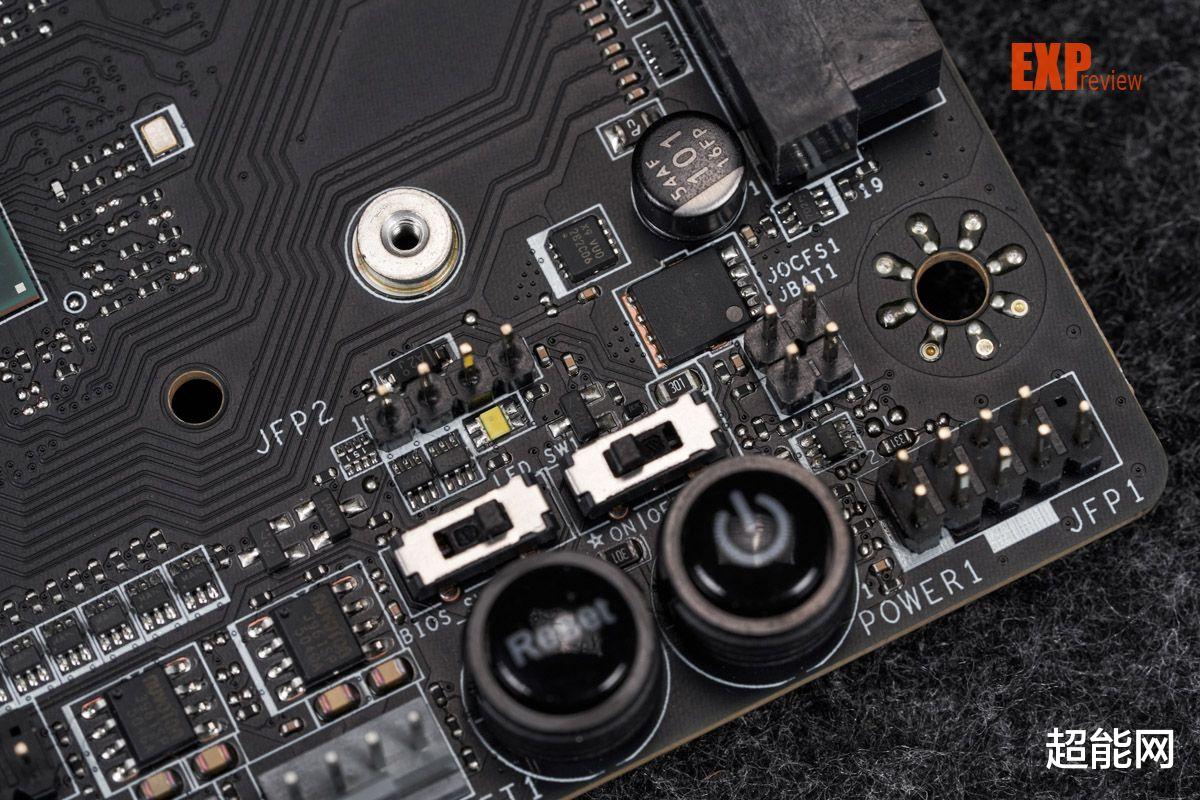 右下角有四个开关,分别是电源、重启、双BIOS切换和板载灯光开关