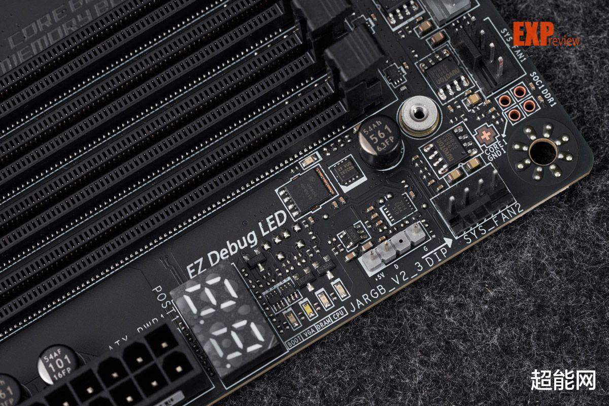 板载接口基本都集中在主板的右侧和下方边缘,主板上一共有8个4pin PWM风扇/水泵接口,分布在主板的右上角和底部边缘,要注意的是位于重启键左侧的4pin口其实是水流计接口,外观完全一样,比较容易搞混。灯带接口有1个12V RGB和3个5V ARGB的,可满足各种需求。还有一个EZ Conn接口,搭配专用线可扩展出1个4pin PWM口、1个5V ARGB接口和1个USB 2.0口,这接口的目的是为了简化ARGB风扇和水冷设备接线。