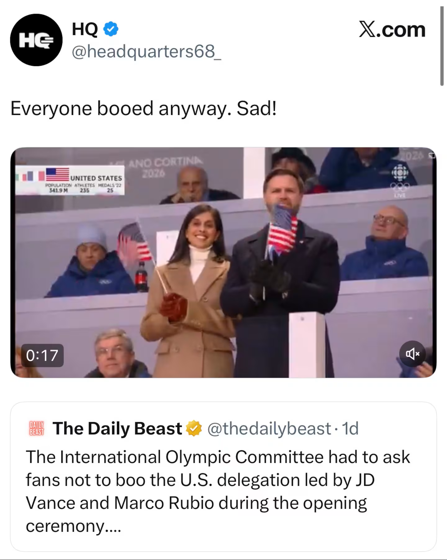 在社交媒体上,白宫分享了一段美国队入场以及万斯鼓掌的视频片段,这段视频来自嘘声已消失的美国全国广播公司的报道片段。