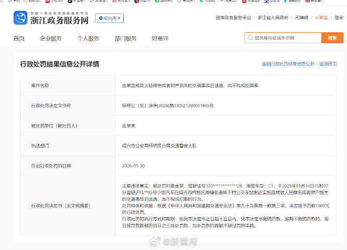 7日,记者在浙江政务服务网查询到金晨肇事逃逸事件处理结果:被处罚对象金某,驾驶证号3701************28,准驾车型:C1,于2025年03月16日15时07分驾驶沪FE**95号小型汽车在绍兴市柯桥区湖塘街道岭下村公交车站附近实施造成致人轻微伤或者财产损失的交通事故后逃逸,尚不构成犯罪的行为。处罚种类和依据:根据《中华人民共和国道路交通安全法》第九十九条第一款第三项,决定给予罚款1500元的行政处罚。行政处罚的执行方式和期限:收到本决定书之日起十五日内,凭本决定书缴纳罚款,逾期不缴纳罚款的,每日按罚款数额的百分之三加处罚款,加处罚款的数额不超过罚款本数。