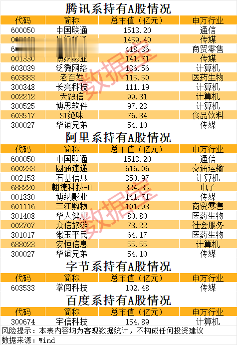阿里系在A股市场有何布局?数据显示,有11家公司前十大流通股东中有“阿里”或“淘宝”这一关键词。字节系通过北京量子跃动科技有限公司持有掌阅科技股权。天眼查显示,北京量子跃动科技有限公司成立于2018年,抖音集团成员,位于北京市,是一家以从事科技推广和应用服务业为主的企业。百度系通过百度(中国)有限公司持有宇信科技。