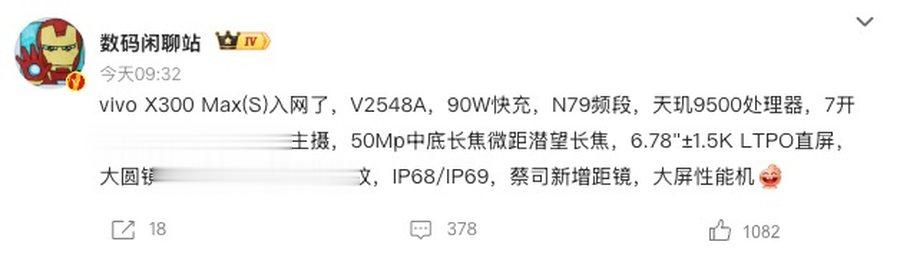 去年10月,vivo正式推出备受市场关注的X300系列旗舰机型,该系列包含X300与X300Pro两款产品,均首发搭载联发科天玑9500旗舰平台,凭借均衡的配置与出色的影像表现,收获了“演唱会神器”“旅拍神器”的用户自发口碑,成为高端市场的热门选择。时隔不到半年,vivoX300系列再添新成员,X300Max正式获得入网许可,作为蓝厂历史上首款以Max命名的高端旗舰,该机的亮相标志着vivo正持续拓宽高端旗舰的产品边界,进一步完善自身旗舰产品矩阵。