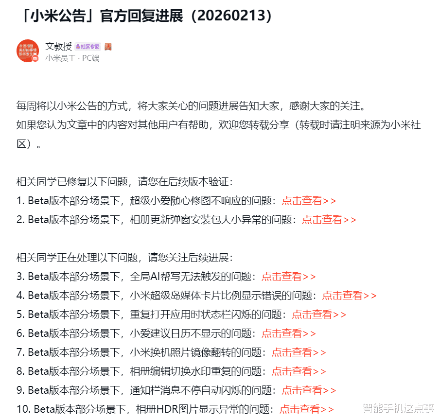 比如2026年2月13日小米官方再次发布了澎湃OS的最新进展公告,这次的重点非常明确,死磕Beta版的细节瑕疵。