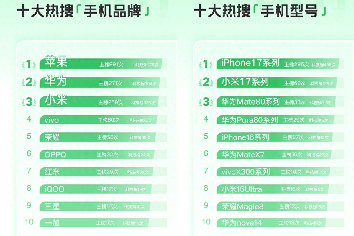 买手机有啥经验之谈没有?俗话说,跟着主流买,别墅靠大海。当然其实根本没有这种俗话,是我自己编的。但跟着大家买主流产品确实有好处,比如有经验分享,有用户交流,遇到各种问题也有人解答和回应。那2025年有哪些手机称得上“热门”呢?今天就来看看结果,原来十大热搜手机型号,苹果、华为和小米就占了八个,看来这确实是多数人的选择。