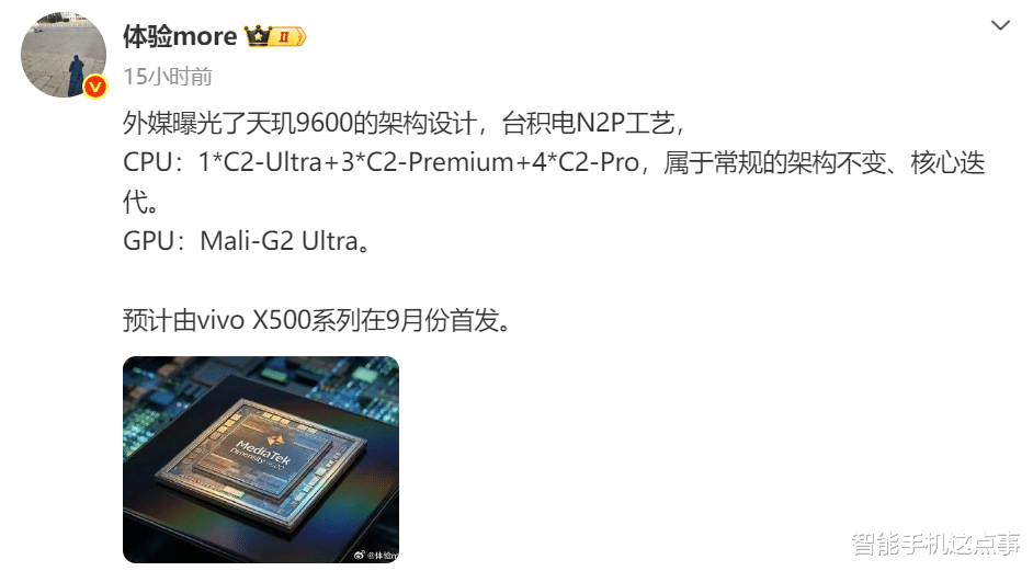 然后就是首发厂商也很清晰了,不出意外就是vivo X500系列,9月登场,这已经是vivo连续第四代首发天玑9系旗舰芯片。