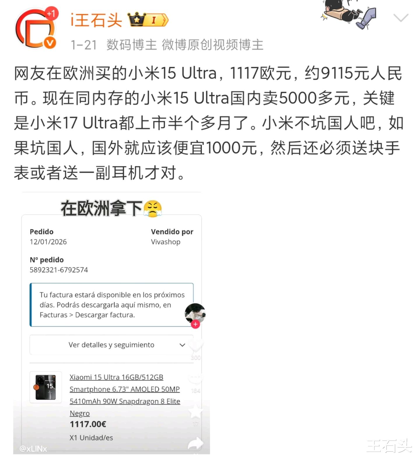 前几天我刷手机的时候,看到有网友晒单说自己在欧洲拿下了一台小米15 Ultra,花了1117欧元,折合人民币大概是9115元。