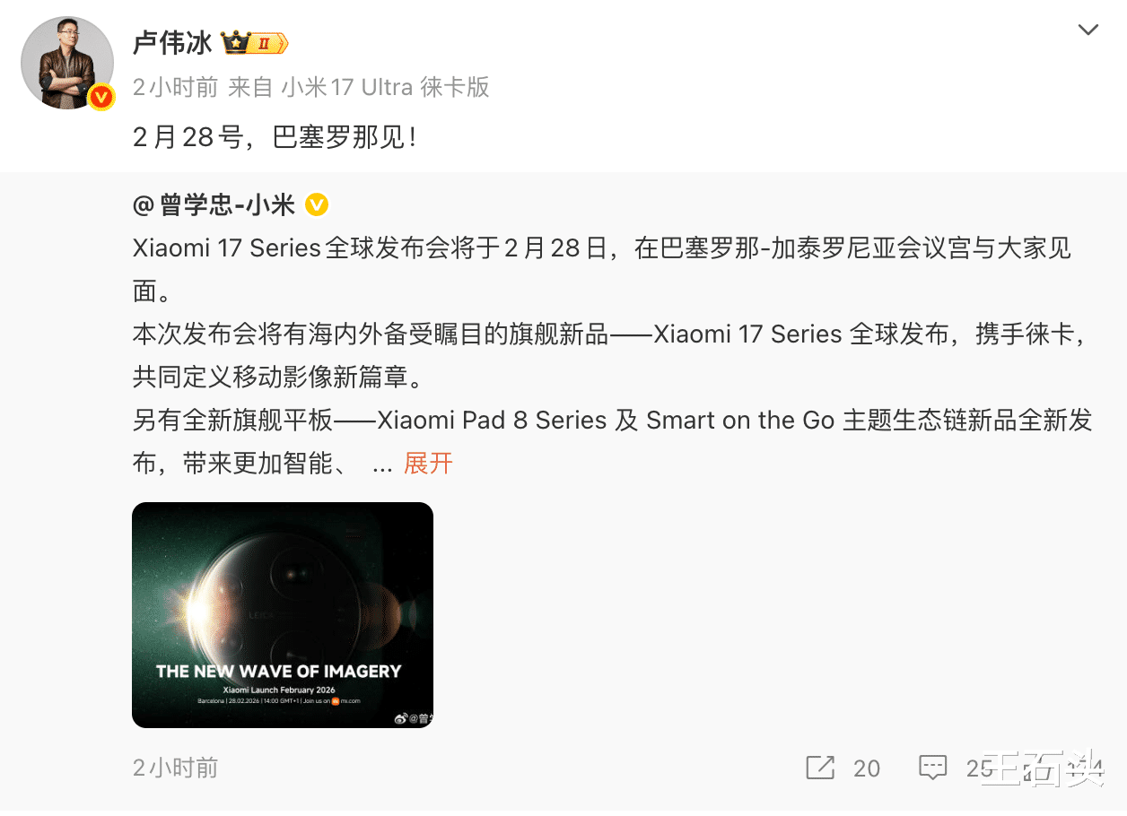 这不现在轮到小米17系列去欧洲市场销售了,现在曾学忠和卢伟冰都已经官宣了,小米17系列全球发布会定档2月28号,地点选在巴塞罗那,就在MWC 2026开幕前一天。